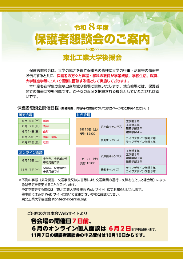 令和8年度 保護者懇談会(旧父母懇談会)に参加し、学科の教員との面談をご希望の方は「イベント情報」ページ より、ご希望の会場を選び申込みをしてください。