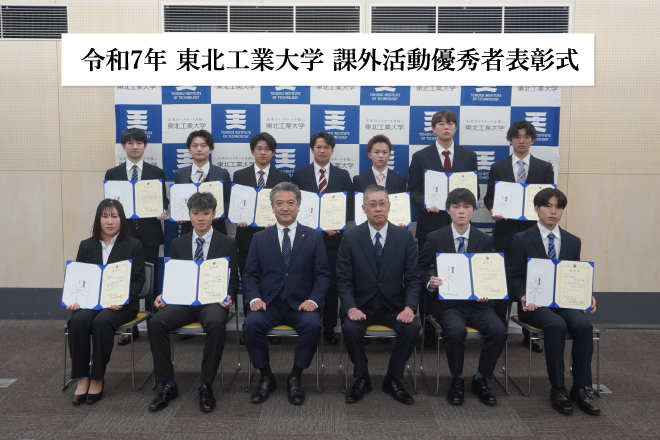 2月6日(金)東北工業大学八木山キャンパスで、課外活動優秀者表彰式が行われました。 事務局 2026.02.13 2月6日(金)東北工業大学八木山キャンパスで、課外活動優秀者表彰式が行われ、後援会から受賞者に副賞がおくられました。 本表彰式は、課外活動連合委員会加盟団体に所属し、優れた成績や活動実績を収めた学生・団体を称えるものです。 令和7年度に体育または文化活動の課外活動において目覚ましい活躍をし、優秀な成績を収めた個人の部21名、団体の部1団体に渡邉学長から表彰状が贈呈され、丹野後援会長から副賞が贈呈されました。